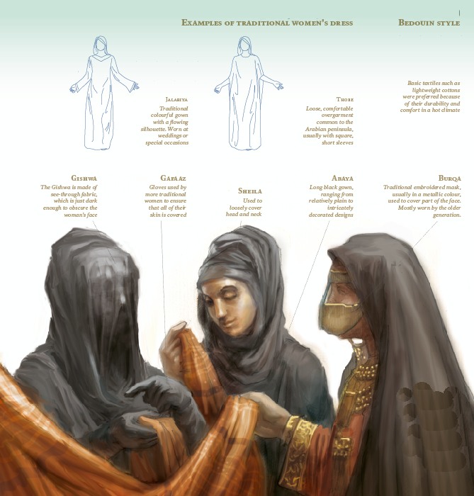 For women The abaya is prevalent, while some women also wear a niqab or cover